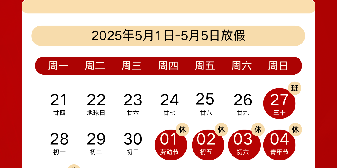 根据国家法定节假日安排,信瑞达公司将于5月1日(星期四)至5月5日(星期一)放假调休,共5天。4月27日(星期日)正常上班。请各部门提前做好工作安排,确保节前项目进度与设备安全检查,假期期间如需紧急技术支持,请联系值班人员。